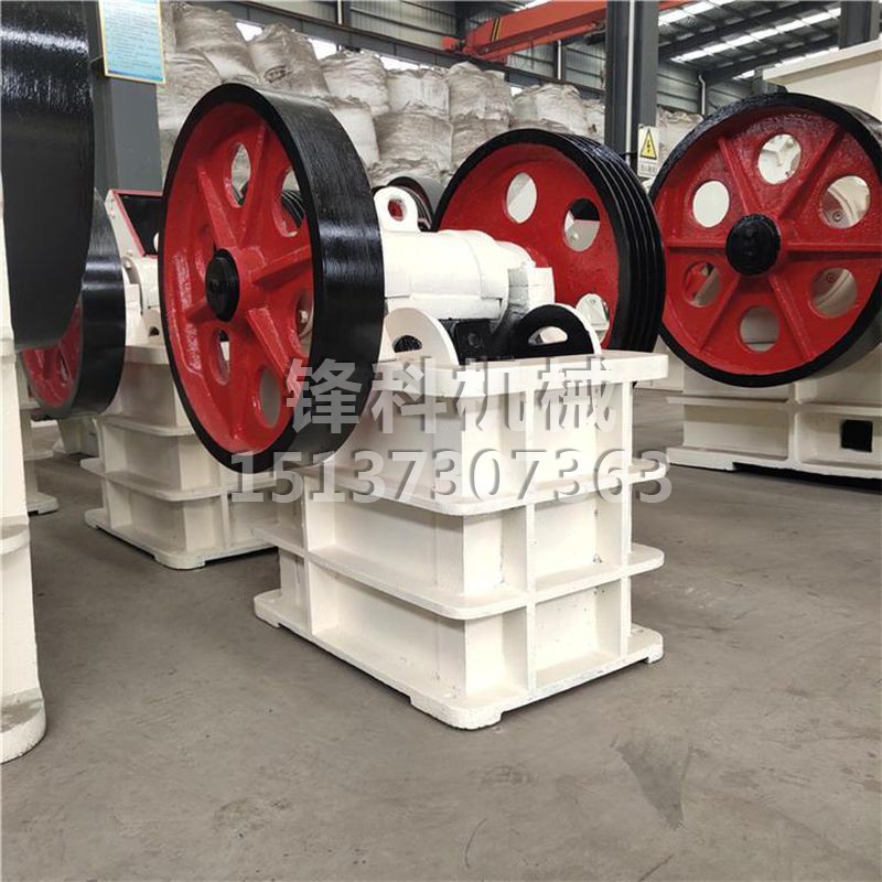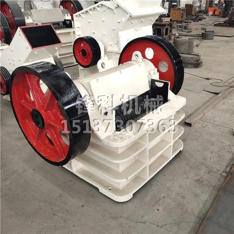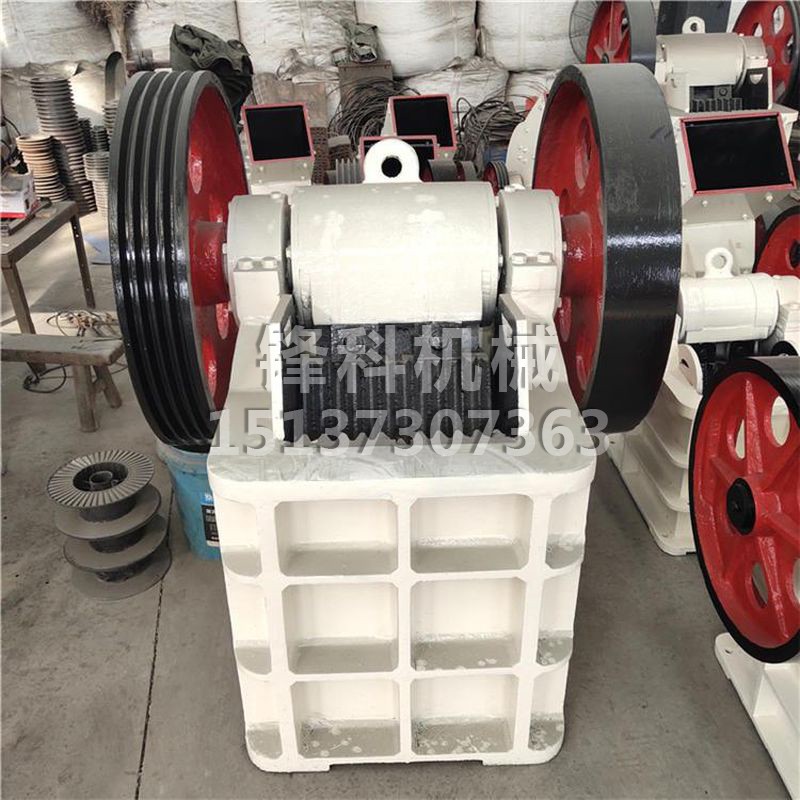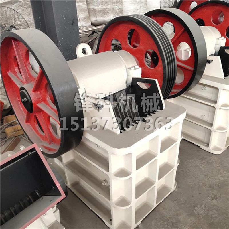 该机主要有机架、偏心轴、大皮带轮、飞轮、动颚、侧护板、肘板、肘板后座、调隙螺杆、复位弹簧、固定颚板与活动颚板等组成,其中肘板还起到保险作用。